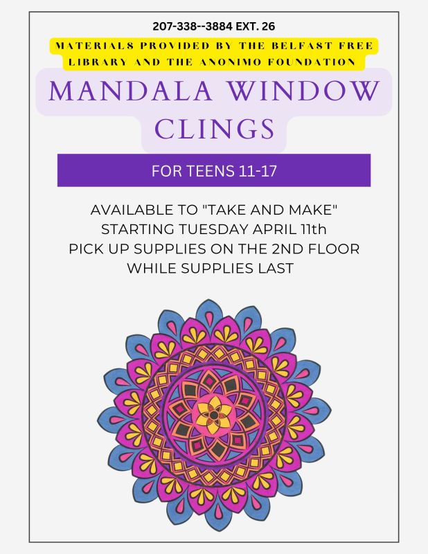 This wonderful, mandala window cling will be available to “Take and Make” starting Tuesday, April 11th. You can pick up materials on the second floor of the Belfast Free Library. This activity will be available while supplies last! All materials provided by the Belfast Free Library, and the Anonimo Foundation.