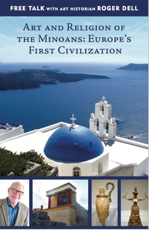 Join Roger Dell on February 7th at 6:30 pm for an introduction to the aesthetic achievements and ritual practices of the Minoans, a prosperous, seafaring, matriarchal, culture that thrived 3500 years ago on the Greek Islands of Crete and Santorini. Many scholars believe this highly-advanced society, which suddenly disappeared, to be the source of Plato’s Atlantis Myth.