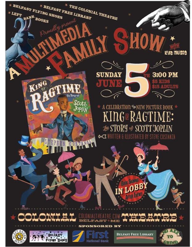 Belfast Flying Shoes presents King of Ragtime: The Story of Scott Joplin with Stephen Costanza – multimedia projections of book art, narration, and live music by 6 talented locals. Sunday June 5, 3:00 pm at the Colonial Theater, 163 High St in Belfast. Info & ticketing at