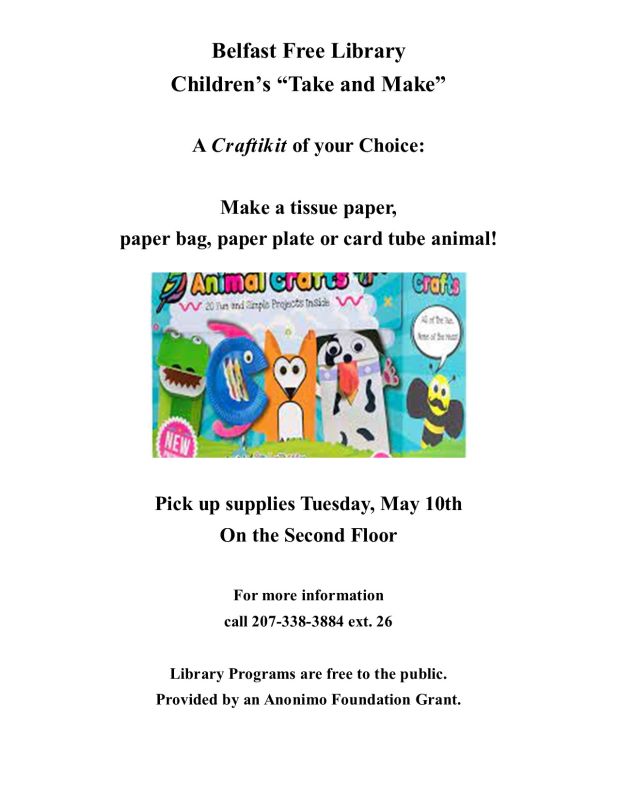 Pick up supplies to make a paper animal on the children’s floor. Option to pick a tissue paper, paper bag, paper plate, or card tube animal. While supplies last.