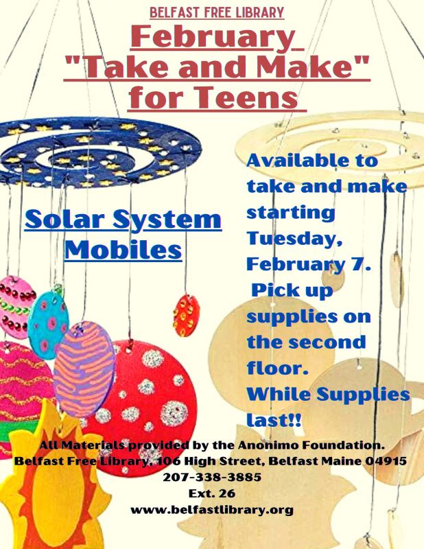 Amazing solar system mobiles are available to “Take and Make”, starting Tuesday, February 7.
