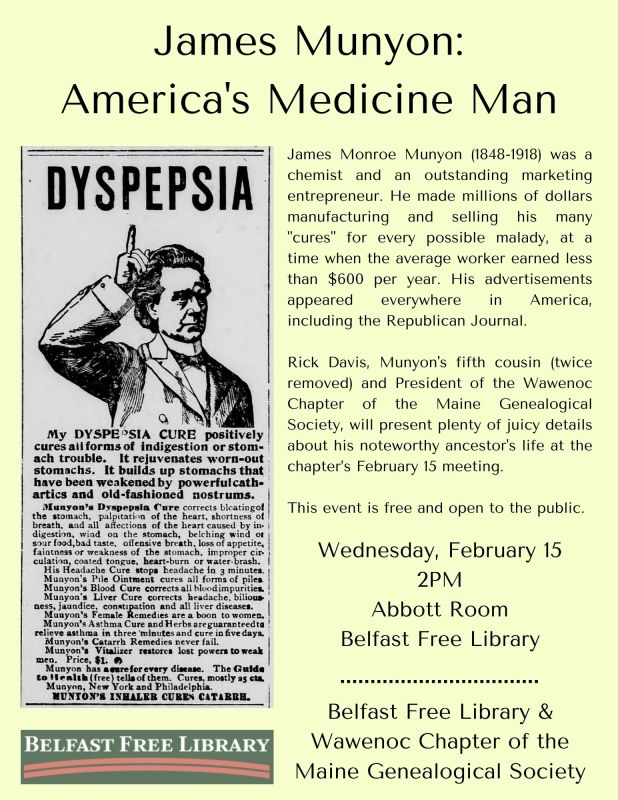 Rick Davis, Munyon’s fifth cousin (twice removed) and President of the Wawenoc Chapter of the Maine Genealogical Society, will present plenty of juicy details about his noteworthy ancestor’s life at the chapter’s February 15 meeting.
