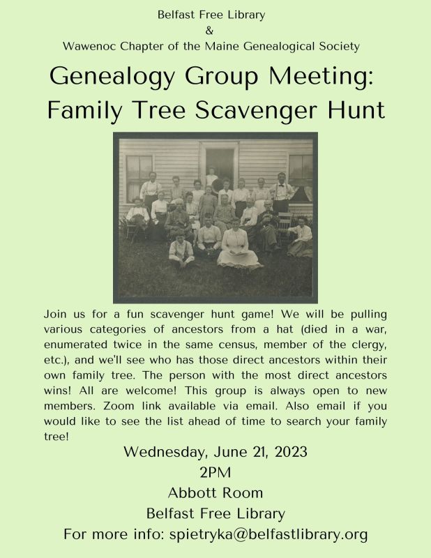 Join us for a fun scavenger hunt game! We will be pulling various categories of ancestors from a hat (died in a war, enumerated twice in the same census, member of the clergy, etc.), and we’ll see who has those direct ancestors within their own family tree. The person with the most direct ancestors wins. All are welcome. This group is always open to new members. Please mail if you would like to see the list ahead of time to search your family tree!