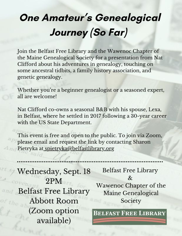 Join us for a presentation from Nat Clifford about his adventures in genealogy, touching on some ancestral tidbits, a family history association, and genetic genealogy. Whether you are a beginner genealogist or a seasoned expert, all are welcome!