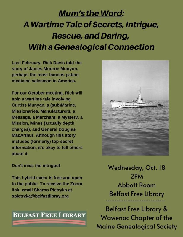 Last February, Rick Davis told the story of James Monroe Munyon, perhaps the most famous patent medicine salesman in America. This time, Davis will spin a wartime tale involving Curtiss Munyan, a (sub)Marine, Missionaries, Manufacturers, a Message, a Merchant, a Mystery, a Mission, Mines (actually depth charges), and General Douglas MacArthur. Although this story includes (formerly) top-secret information, it’s okay to tell others about it. Don’t miss the intrigue!