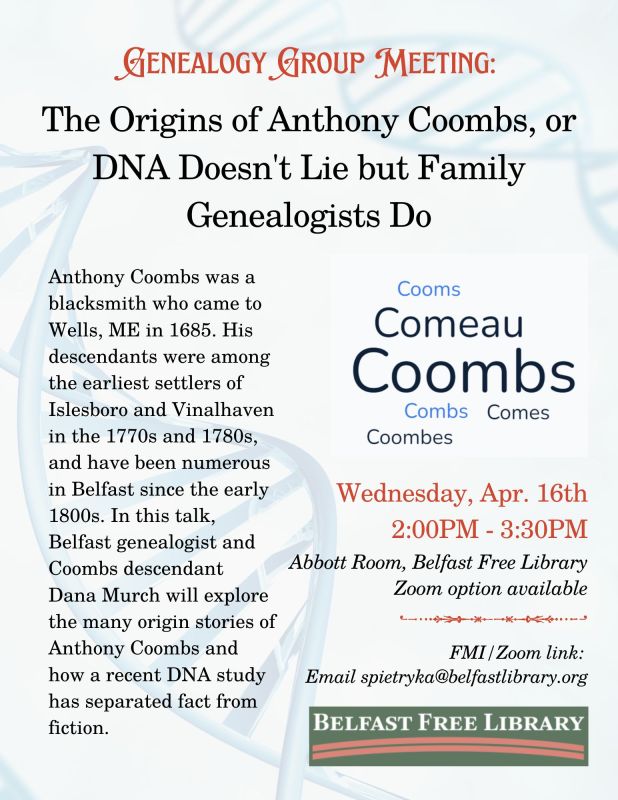 Anthony Coombs was a blacksmith who came to Wells, ME in 1685. His descendants were among the earliest settlers of Islesboro and Vinalhaven in the 1770s and 1780s, and have been numerous in Belfast since the early 1800s. In this talk, Belfast genealogist and Coombs descendant Dana Murch will explore the many origin stories of Anthony Coombs and how a recent DNA study has separated fact from fiction.