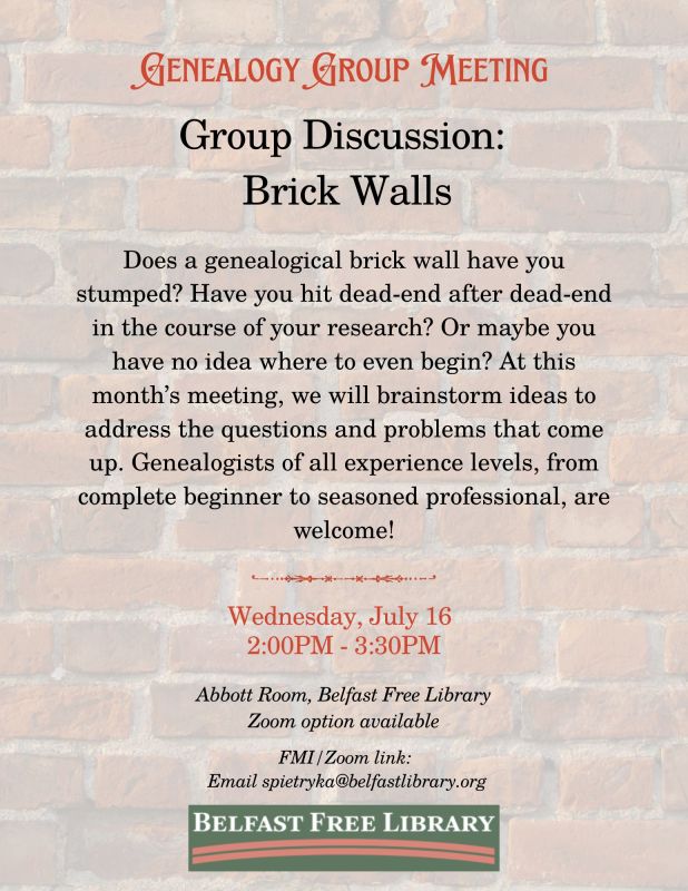 Does a genealogical brick wall have you stumped? Have you hit dead-end after dead-end in the course of your research? Or maybe you have no idea where to even begin? At this month’s meeting, we will brainstorm ideas to address the questions and problems that come up. Genealogists of all experience levels, from complete beginner to seasoned professional, are welcome!