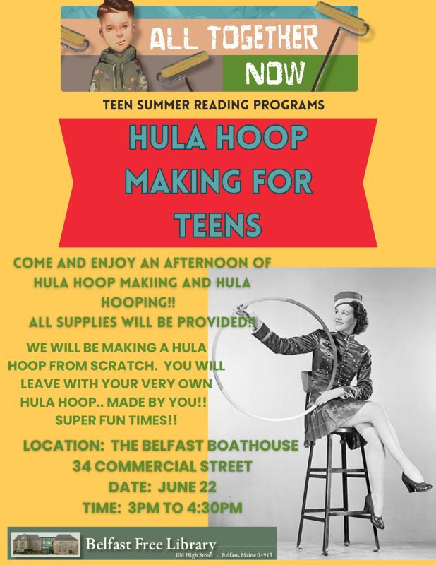This program is the first in our Summer Reading Program Series for Teens. Come and enjoy an afternoon of hula hoop making and hula hooping!! We will be making a hula hoop from scratch. You will leave with your very own hula hoop.. made by you!! Super fun times!! We will also be learning some sweet hula hoop tricks, and hooping to music at the boathouse!!