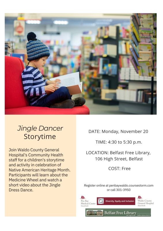 Join Waldo County General Hospital’s Community Health staff for a children’s storytime and activity in celebration of Native American Heritage Month. Participants will learn about the Medicine Wheel and watch a short video about the Jingle Dress Dance.