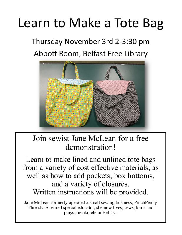 Do you want to learn to make your own reusable fabric tote bag? Are you puzzled about adding a lining? Join sewist Jane Mclean in the Abbott Room as she demonstrates how to create lined and unlined bags from a variety of cost effective materials. She will show how to add pockets, box bottoms, closures, and a waterproof lining. Written instructions will be provided.