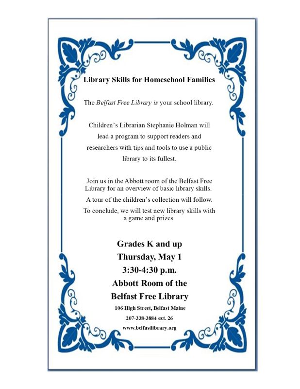 Children’s Librarian Stephanie Holman will lead a program to support readers and researchers with tips and tools to use a public library to its fullest. Join us in the Abbott room of the Belfast Free Library for an overview of basic library skills. A tour of the children’s collection will follow. To conclude, we will test new library skills with a game and prizes.