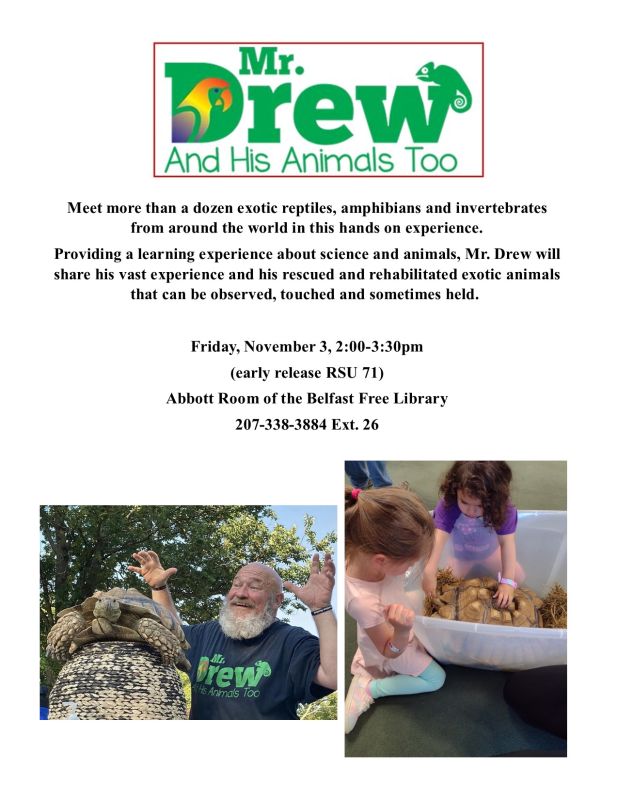 This popular presentation returns to your Belfast Free Library. An opportunity to interact with the animals follows Mr. Drew’s talk.