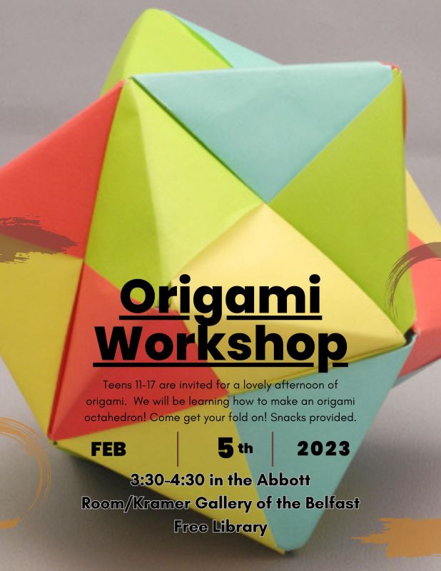 Teens 11-17, and fun adults are invited to a lovely afternoon of origami! We will learn how to make an origami octahedron! You will literally be taking one home with you! Come get your fold on!! Snacks will be provided, and they will be delicious!