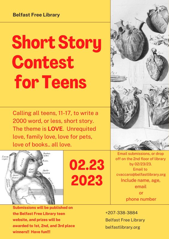 Submissions will be published on the Belfast Free Library teen website, and prizes will be awarded to 1st, 2nd, and 3rd place winners!! Have fun!!!