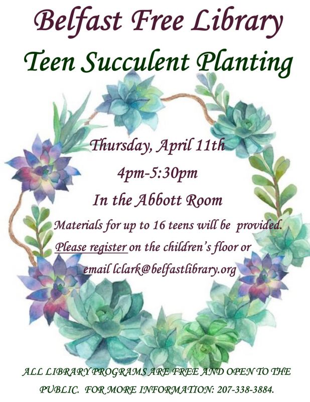 Come out and plant a succulent! Plants do many great things such as; purify the air, brighten your atmosphere, improve focus and enhance memory. This is open to teens ages 11-17. Materials for up to 16 teens will be provided. You must register by emailing lclark@belfastlibrary.org, or at the children’s floor desk. Event is in the Abbott Room at the library, Thursday April 11th 4pm-5:30pm. All library programs are free and open to the public. For more information: 207-338-3884.