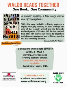 A variety of facilitated discussion sessions (both live and via Zoom) will be offered in April. To register for the discussion at the library visit www.waldoreads.org or contact Denise Pendleton at  dpendleton@rsu71.org.