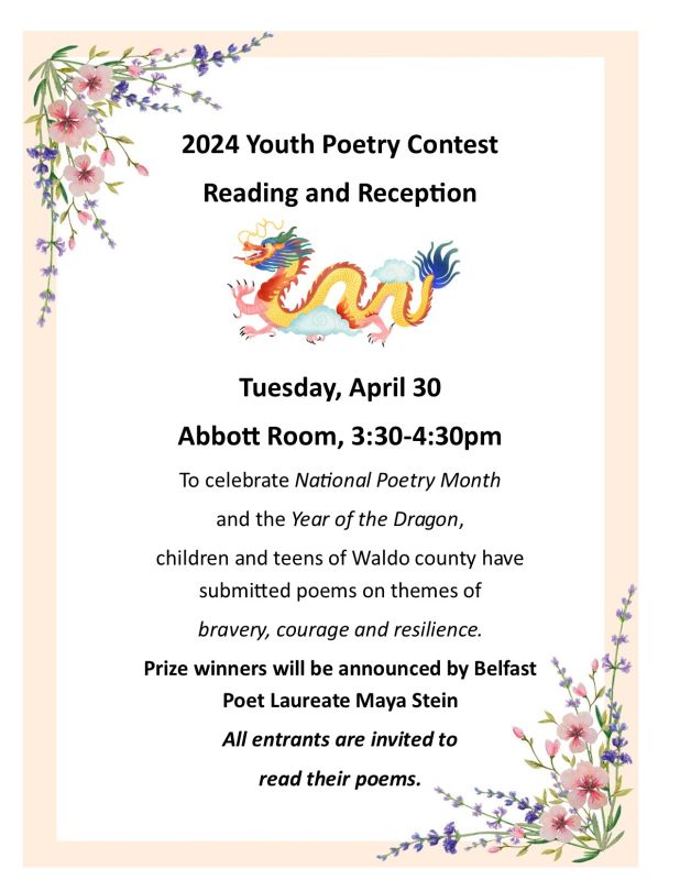 To celebrate National Poetry Month and the Year of the Dragon, children and teens of Waldo county have submitted poems on themes of bravery, courage and resilience. Prize winners will be announced by Belfast Poet Laureate Maya Stein.
